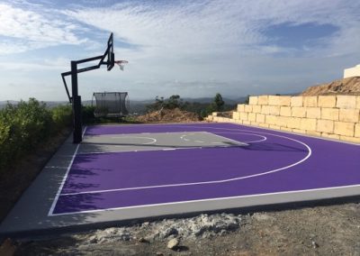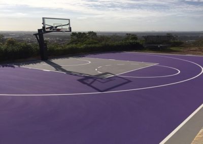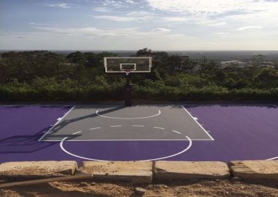What better way to encourage your family to get outside and active, than to construct a half basketball court with a fantastic view! The Dynamic Sports Facilities team worked with this repeat client (who recently moved and asked him to build another court for him) to construct a cushioned half basketball court at his Gold Coast property. The court consisted of a cushioned HSA surface in Tour Purple and Mid Grey. The basketball tower was a Goalrilla GC72c.