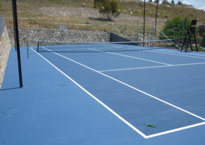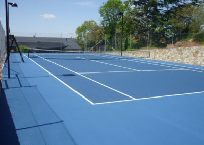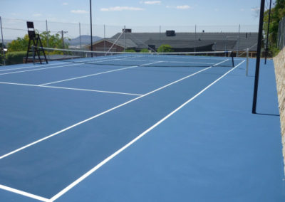 Tennis court in acrylic paint system finished in Royal Blue play with Ocean Blue surrounds.