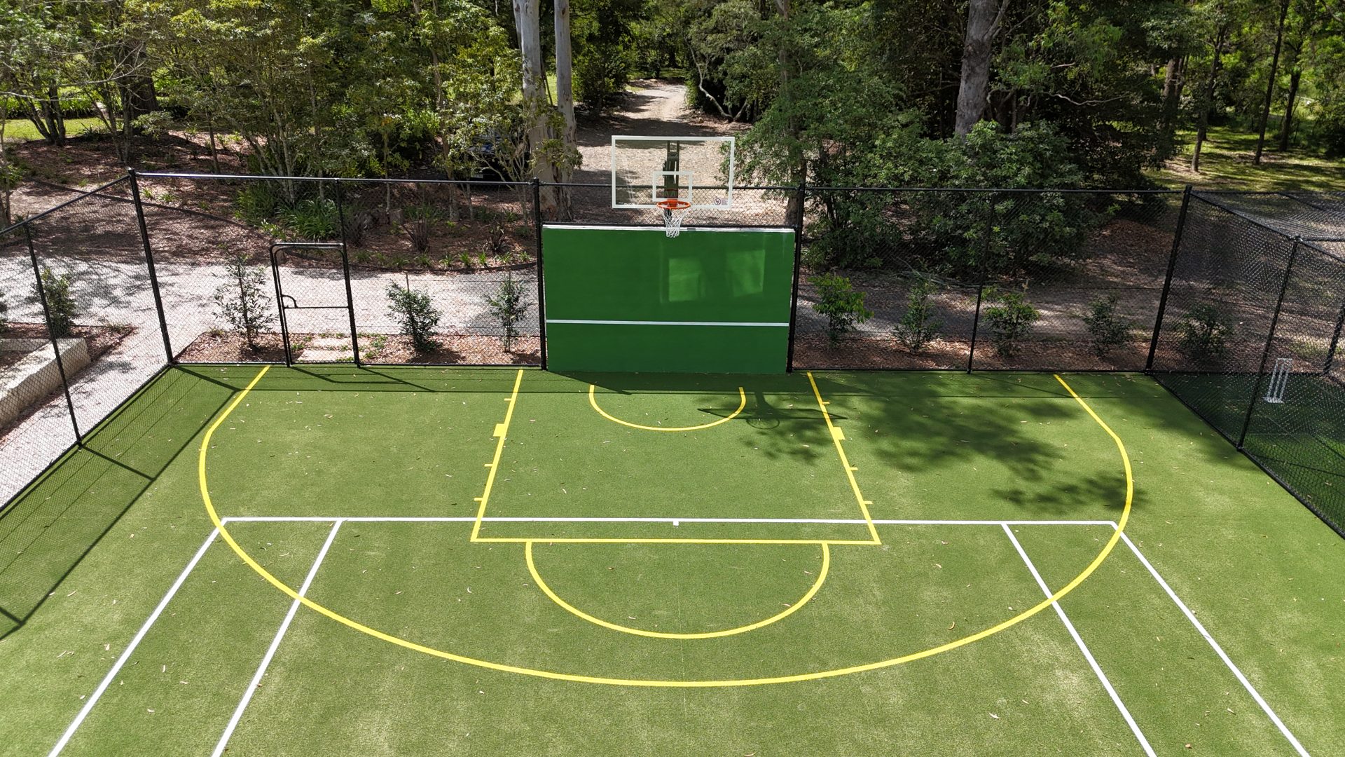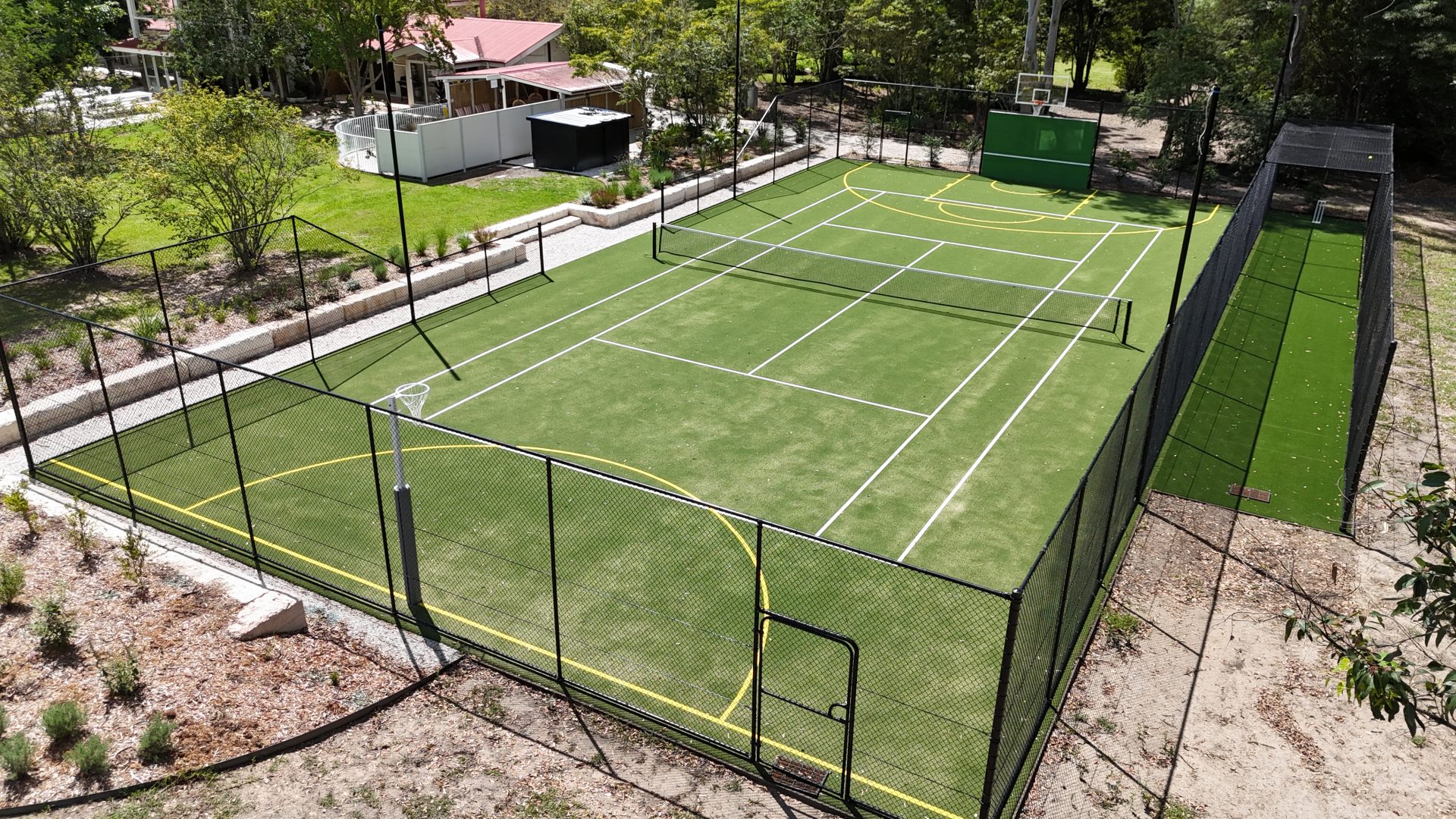 To maximise versatility, the tennis court includes professionally cut basketball and netball line markings. The installation is complemented by premium sporting equipment, including the Force 10 Basketball Tower and NB320 Netball Posts, ensuring the space functions as a complete multi‑sport facility for the household.