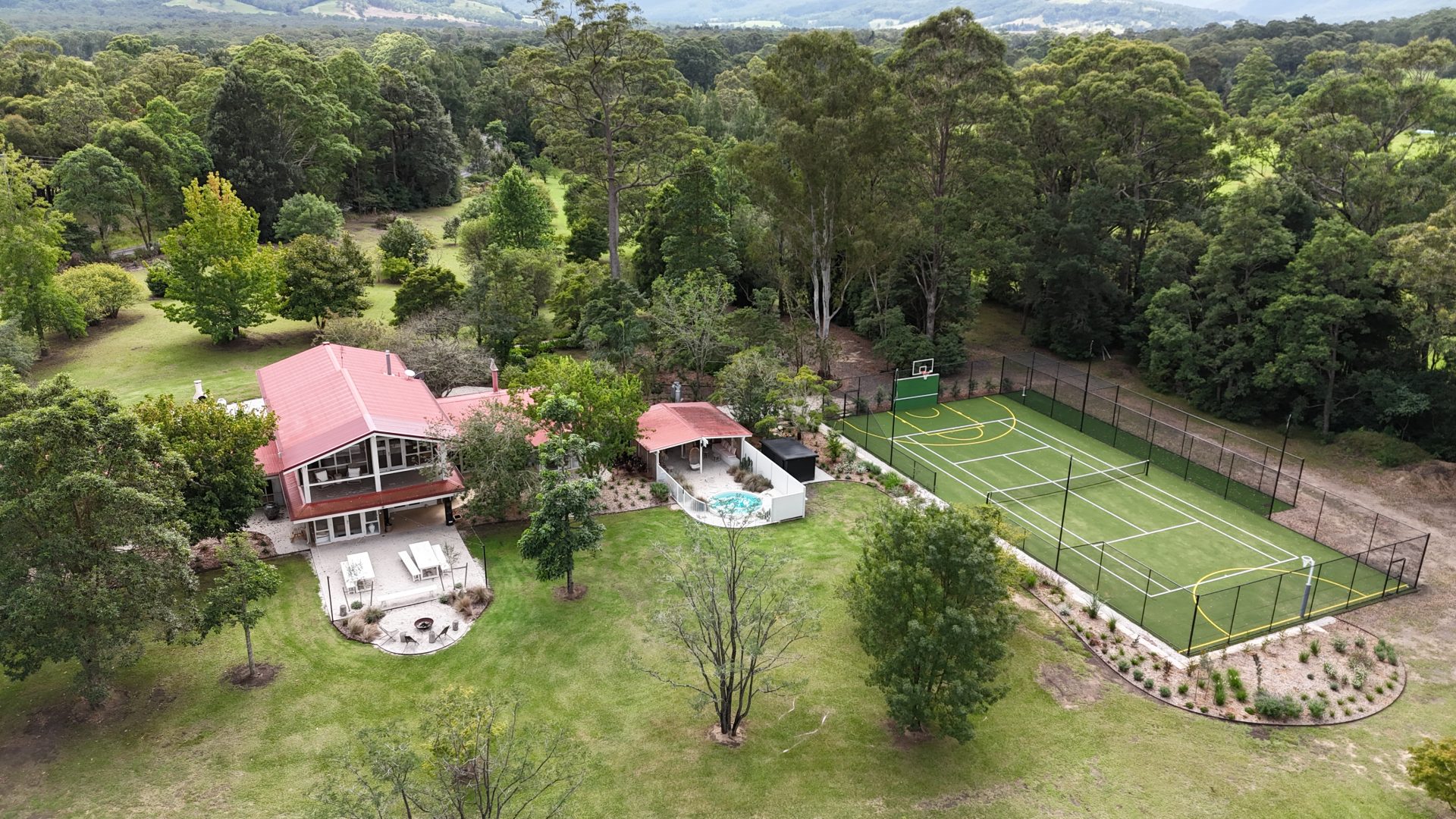 The new tennis court features Urban Active Grass, a premium synthetic tennis court surface chosen for its consistent playability, resilience and low maintenance requirements. This advanced surfacing allows the homeowners to enjoy a true all‑weather tennis experience year‑round, making it ideal for the climate conditions of the Kangaroo Valley region.